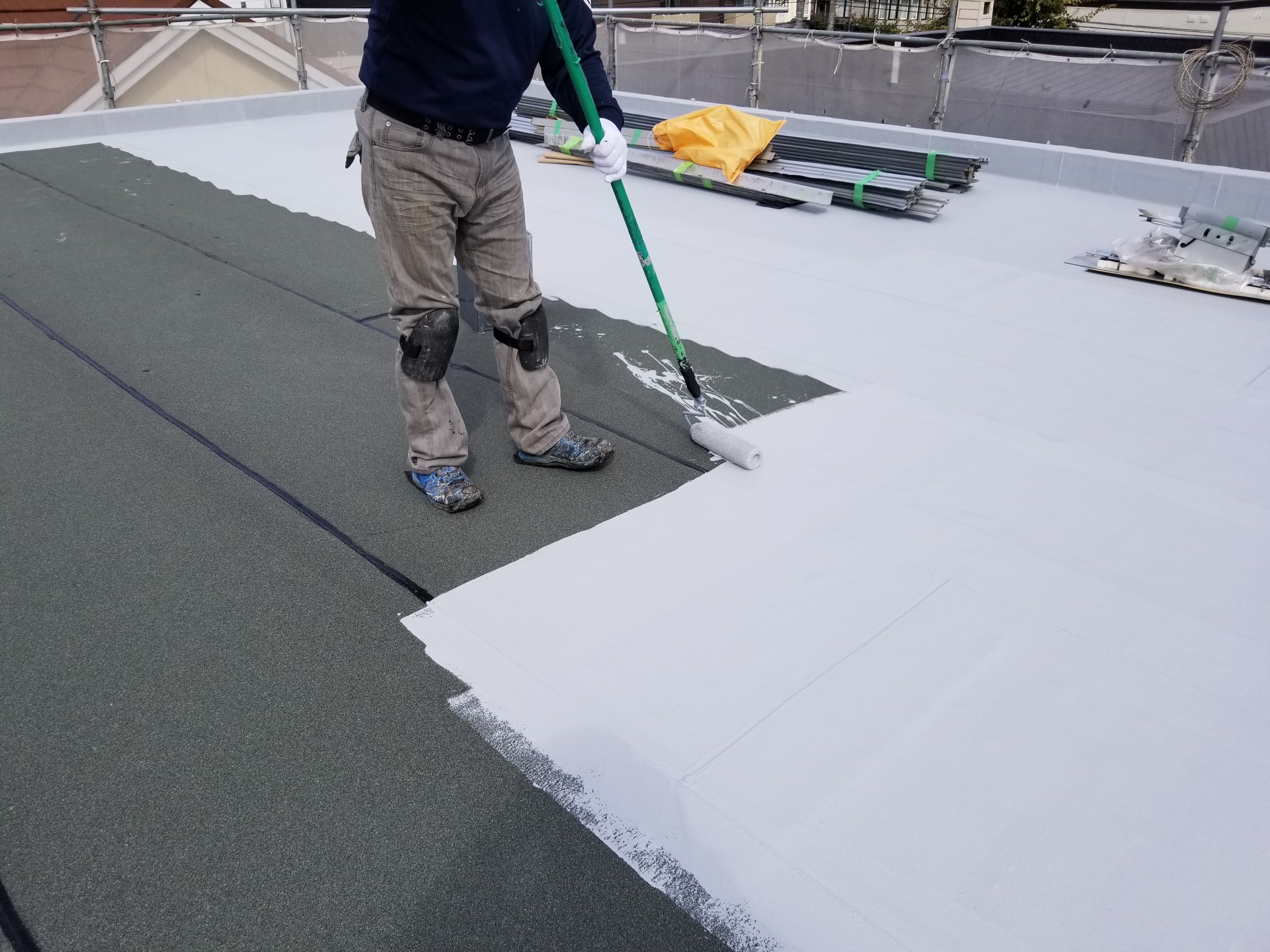 塗膜防水なので、材料を持ち運ぶのは一斗缶かバケツになりますが、小分け以外は混ぜた材料を、天端を切ったバケツ代わりの一斗缶に入れて運び、そのまま使用するのが一般的です。